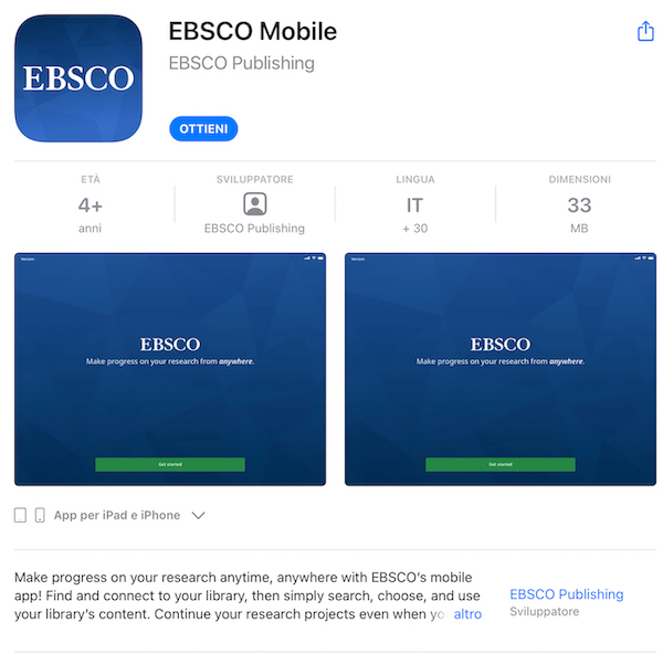 L'app EBSCO Mobile è disponibile per dispositivi iOS (iOS 11+) su iTunes App store e per Android (Android 5+) su Google Play.